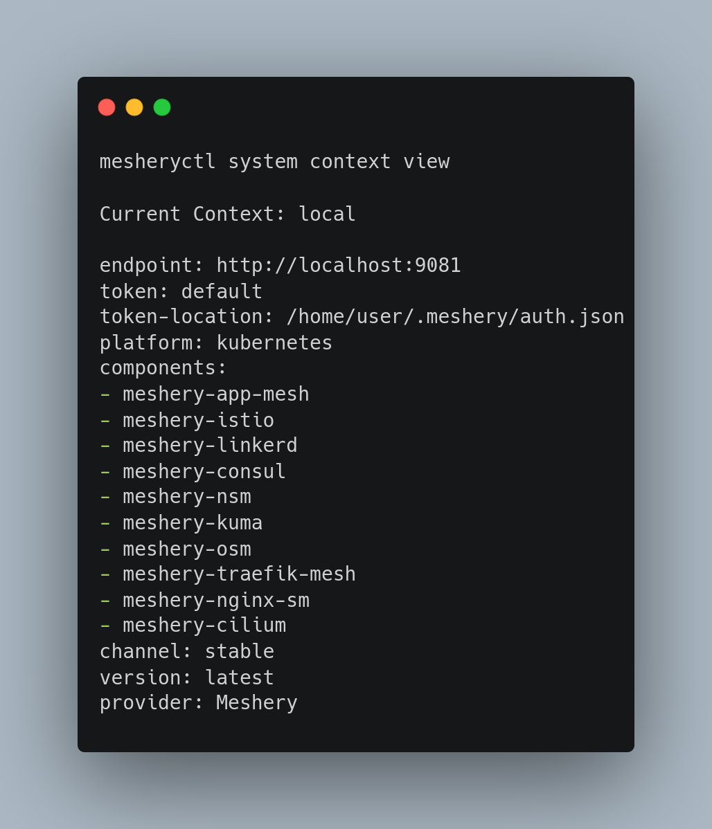 • Run the following command to see the current configuration for Meshery: